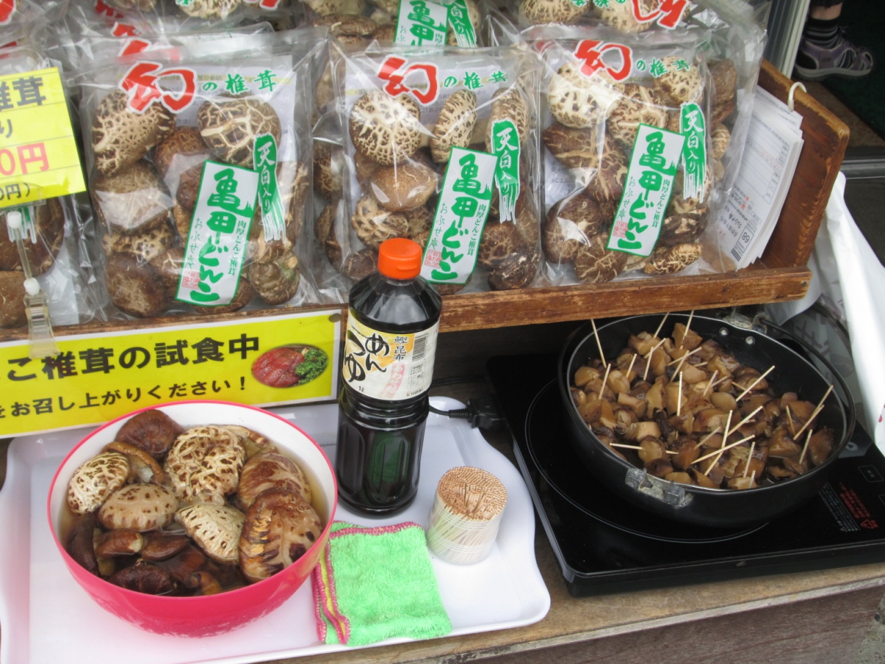 おぶせ庵の店先には、肉厚の椎茸亀甲どんこが一等席を取り、その横で、どんこ椎茸の試食販売をしていました。