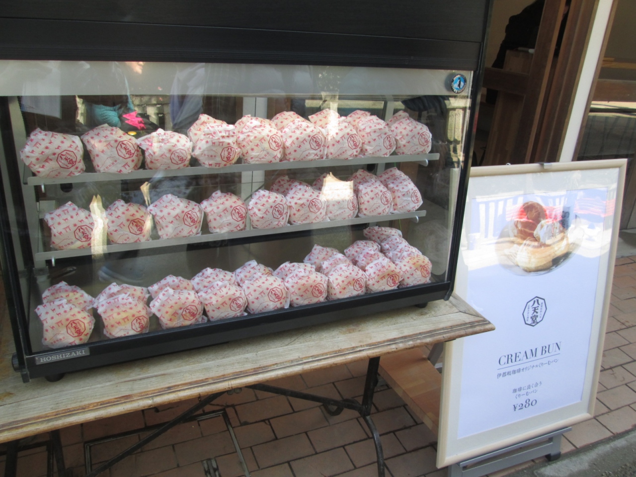 厳島神社参拝後に向かった五重塔に至るところに伊都岐珈琲なる喫茶店があり、ここに陳列されていた八天堂くりーむパンを購入する女性達が列を作っていました。