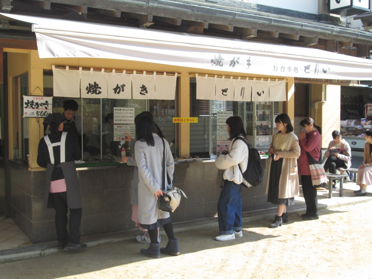 豊国神社の見学後石段を下りた先で、蛎殻が焼ける香りが漂ってきて、その先では焼き牡蛎を販売していました。