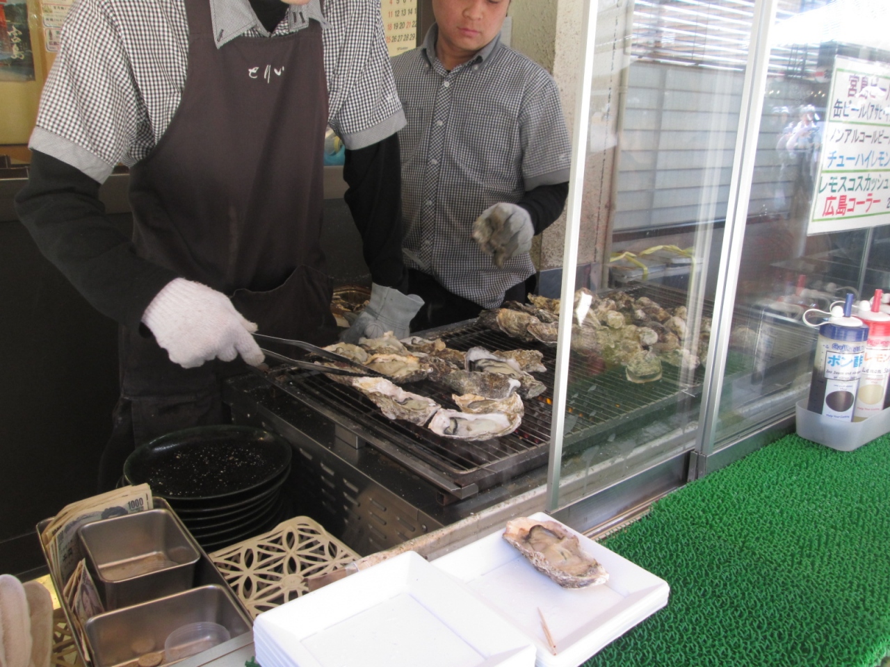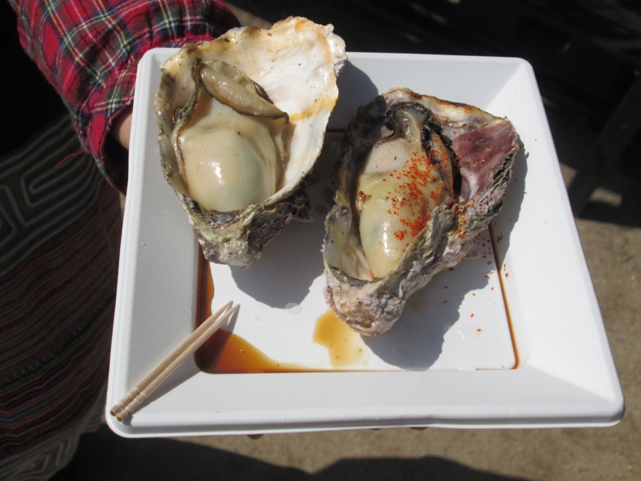 そこそこの観光客が牡蛎の焼けるのを待っており、私達も臭いにつられて列に参加。