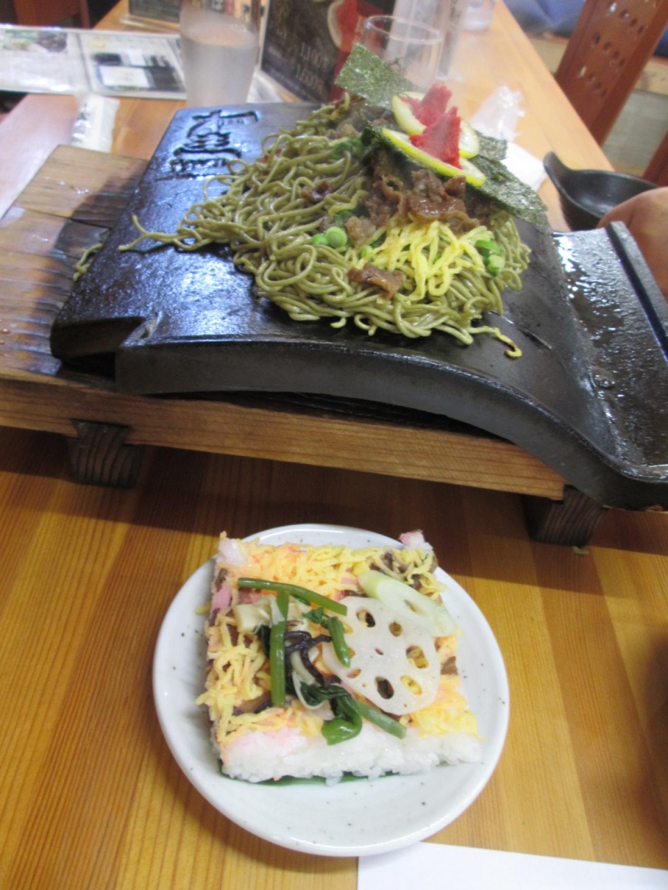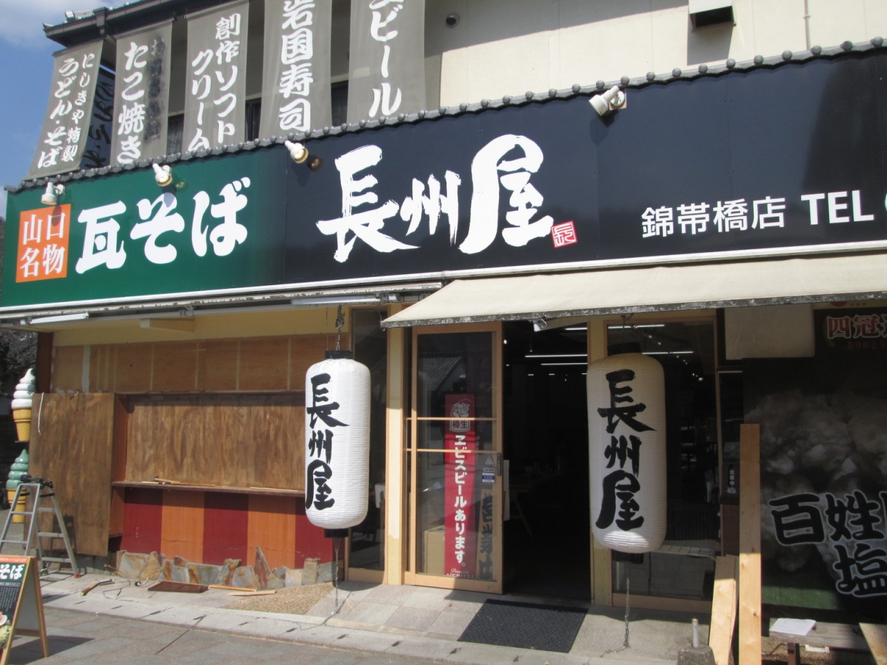 錦帯橋を渡り、吉香公園入口の数件の飲食店街で「山口名物瓦そば」の看板を掲げた長州屋錦帯橋店を見つけ、その瓦そばに好奇心を持って入店し、瓦そばと岩国すしを注文。
