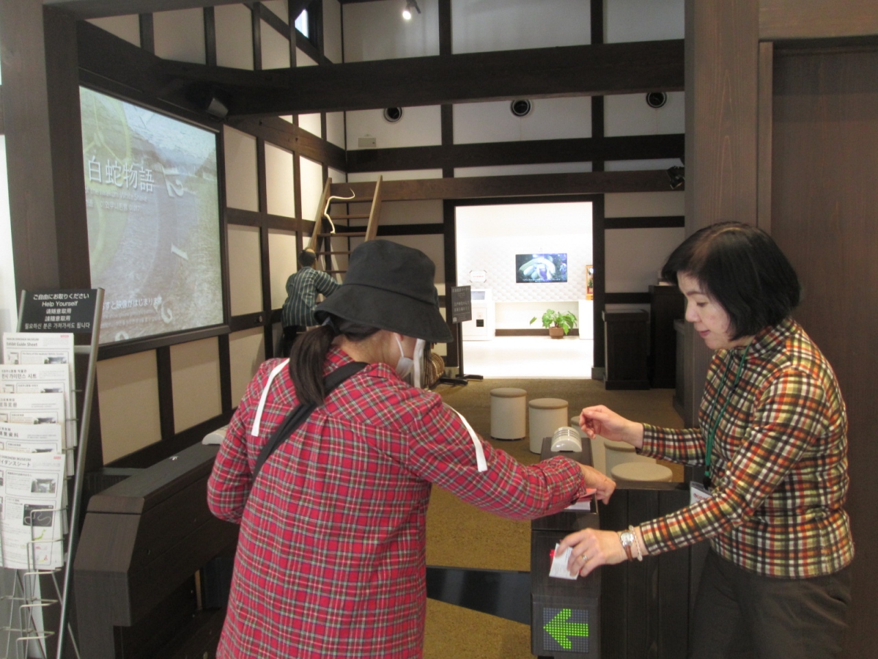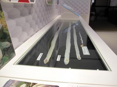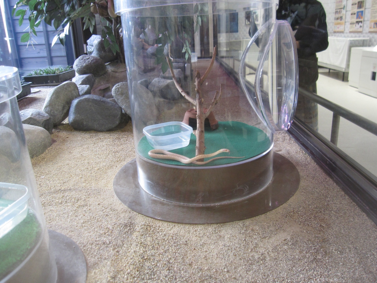 シロヘビは突然変異のアオダイショウで、昔から岩国だけに集中して生息し、ここ博物館では生体の展示、資料や模型の展示、映像を公開され、シロヘビグッズの売店もあります。