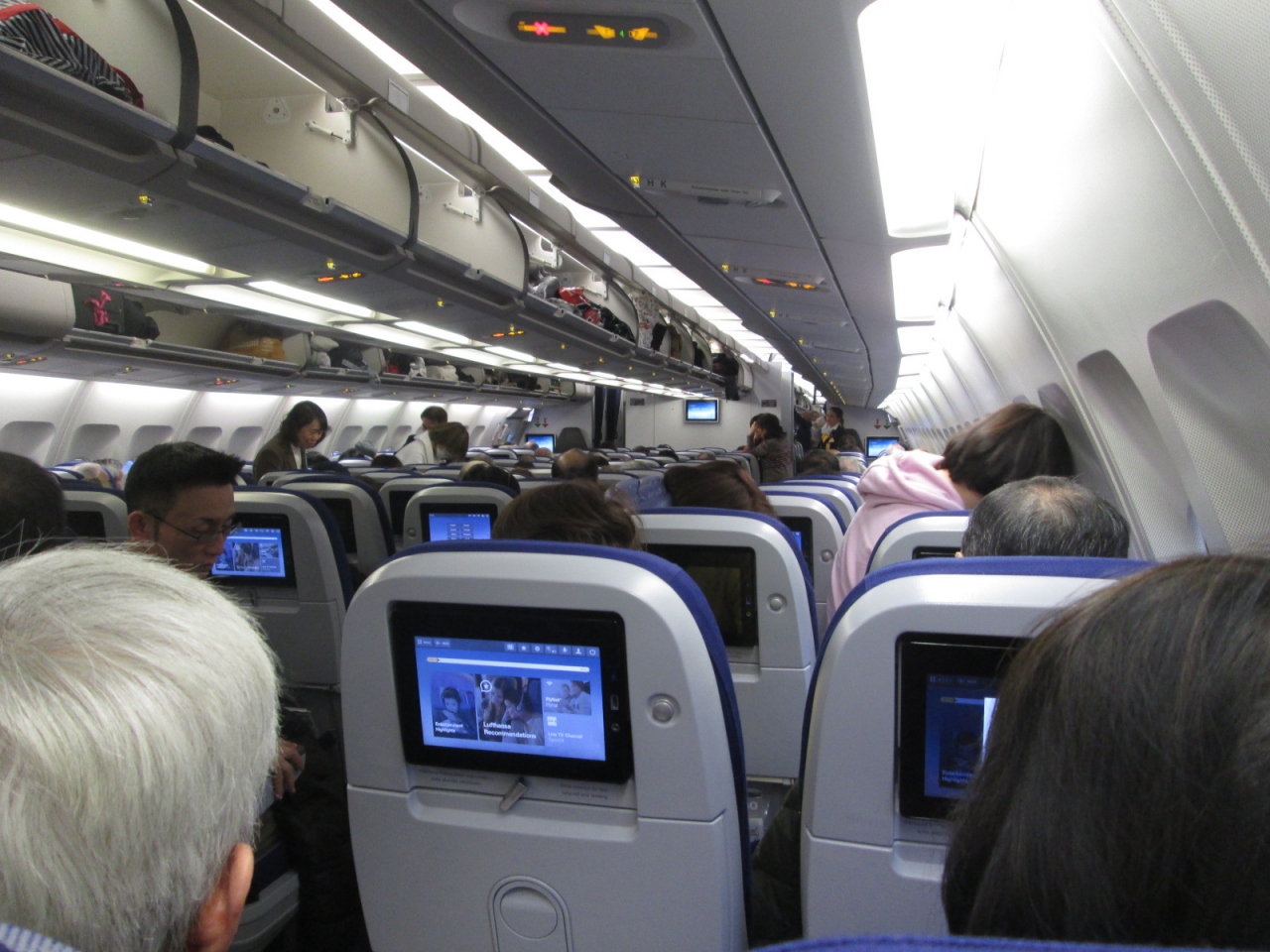 エコノミークラスの客室は、左右2列で中央に4列のシート。各席のモニターの内容や機内食も充実しており、所要11時間50分を快適に過ごせました。- 旅行時期