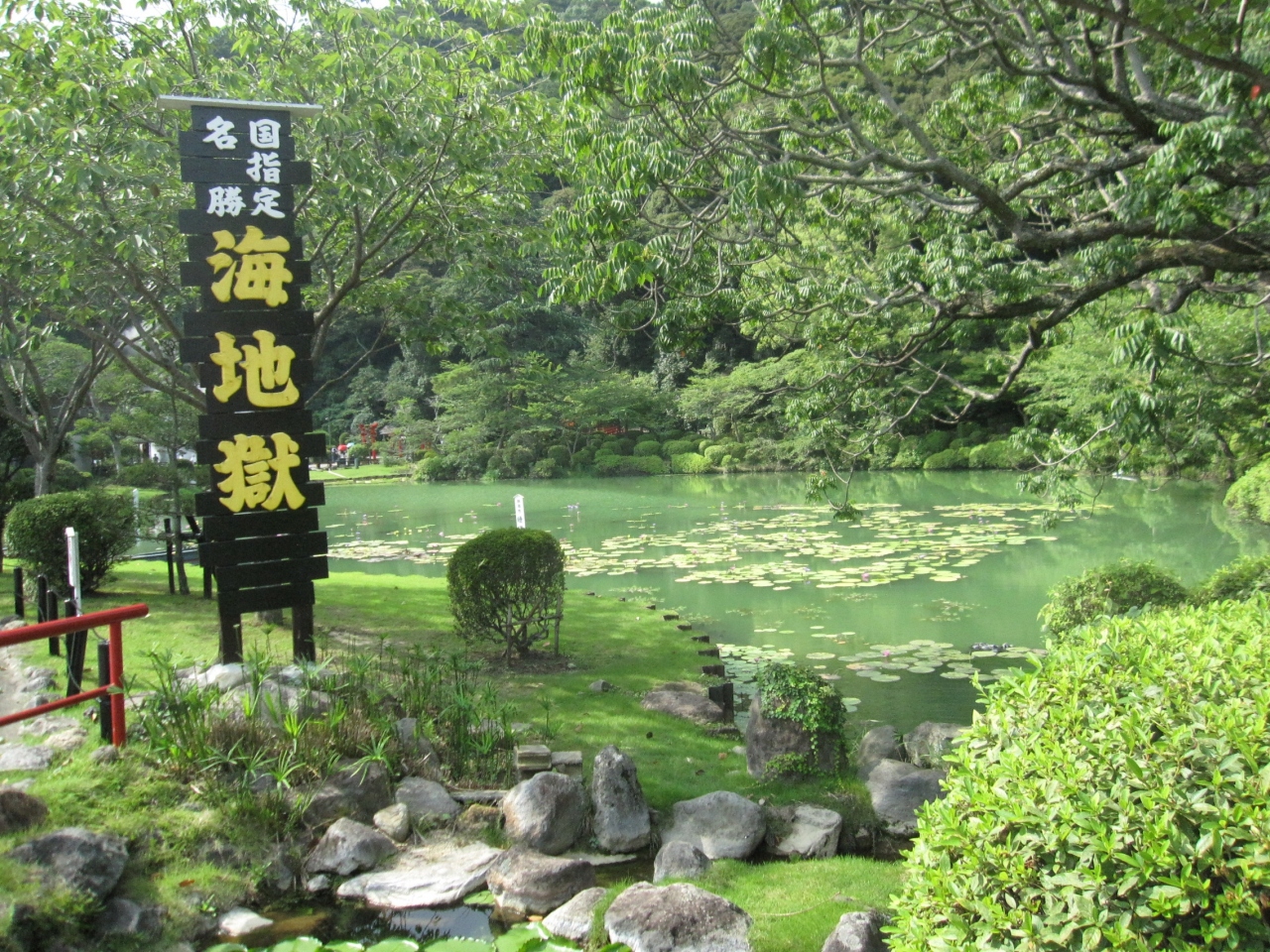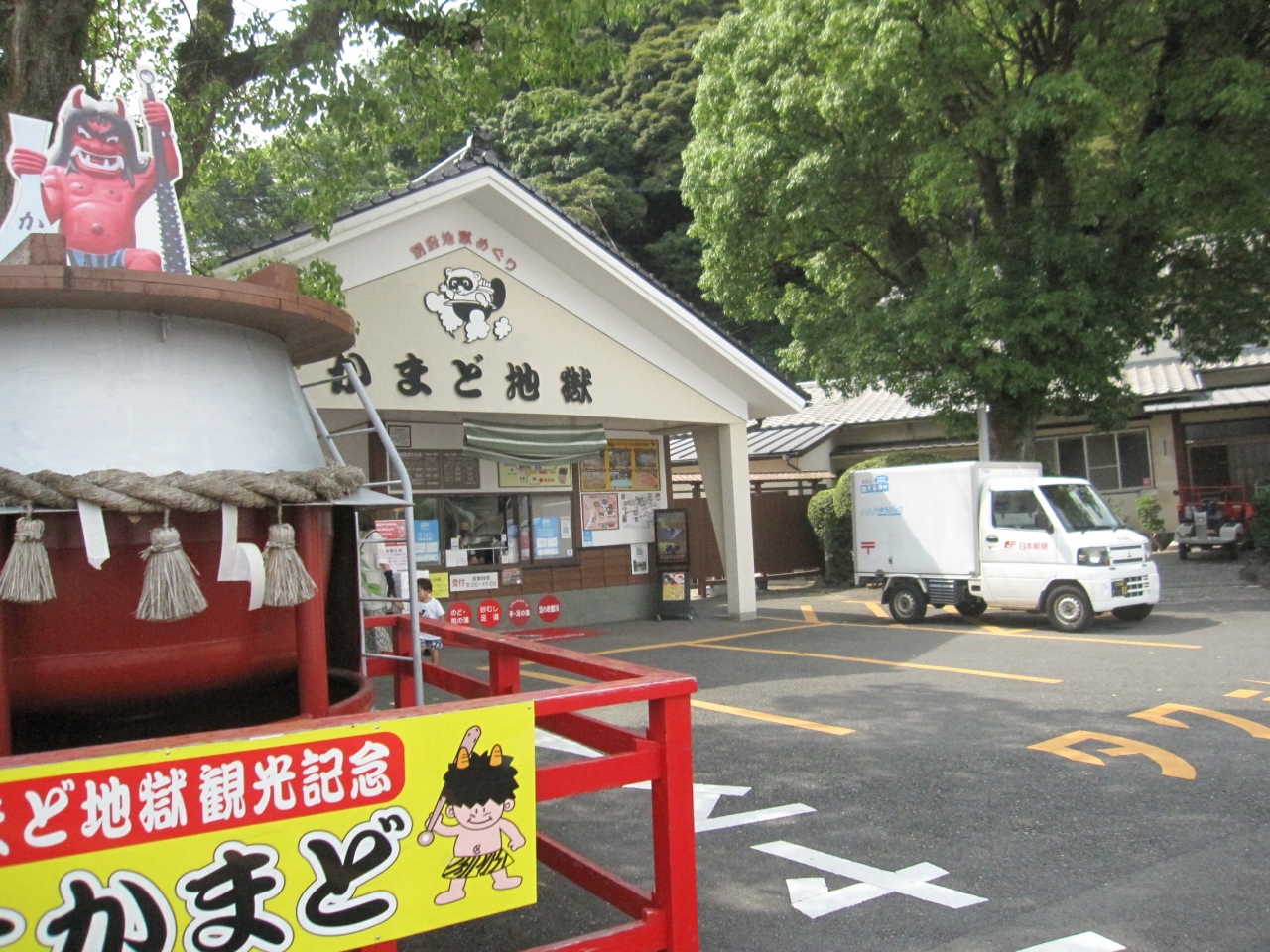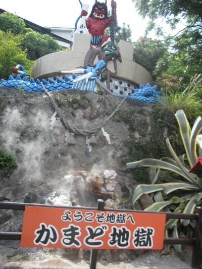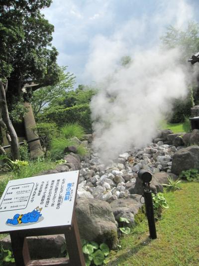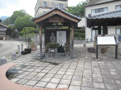 地獄めぐり観光のメインストリート「みゆき坂」を下るとその先は「いでゆ坂」となり、その坂の石段を上がったところに「むし湯と足蒸し」のスポット、それに「鉄輪むし湯」や周辺の温泉を開いたとされる鎌倉時代中期の僧侶「一遍上人」の像がありました。