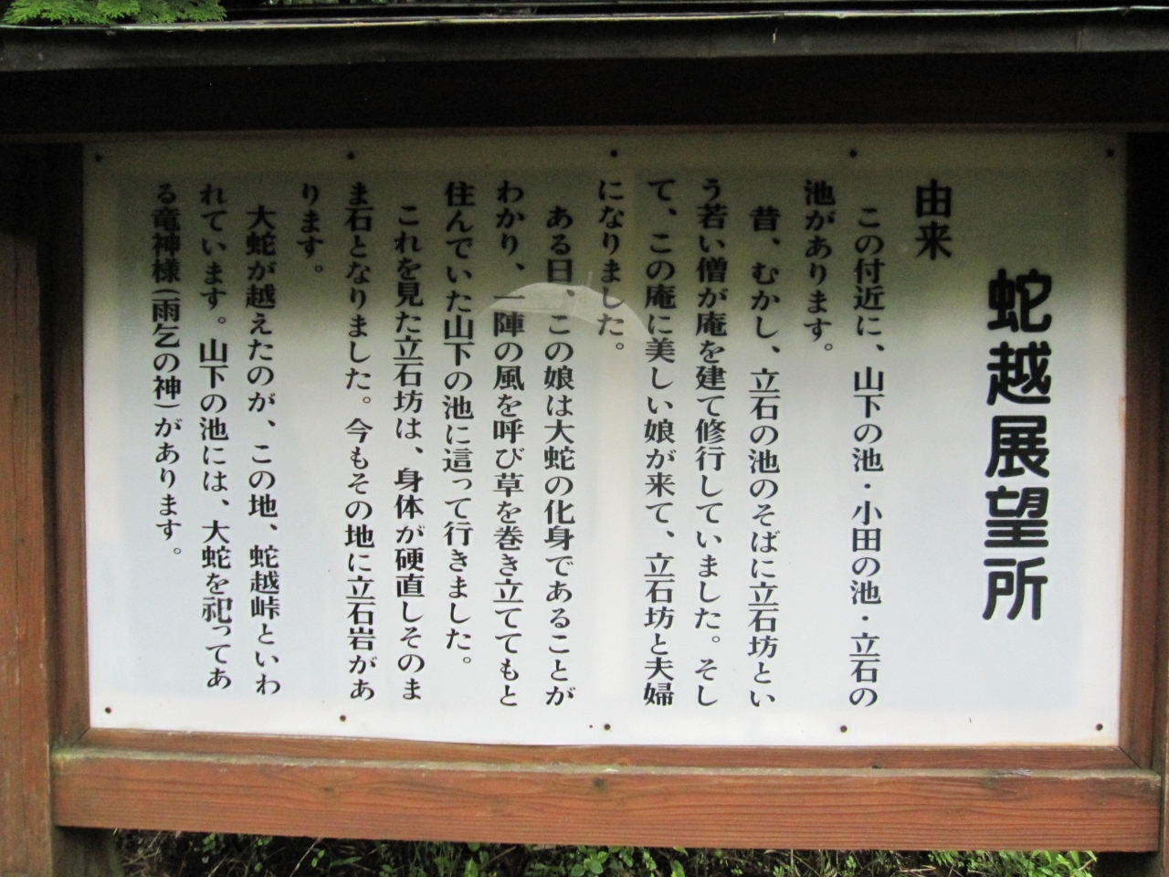 そこは、昔々大蛇がこの峠を越えて湖(展望台近くの山下池)に帰って行ったという大蛇伝説から蛇越峠と名付けられたそうです。
