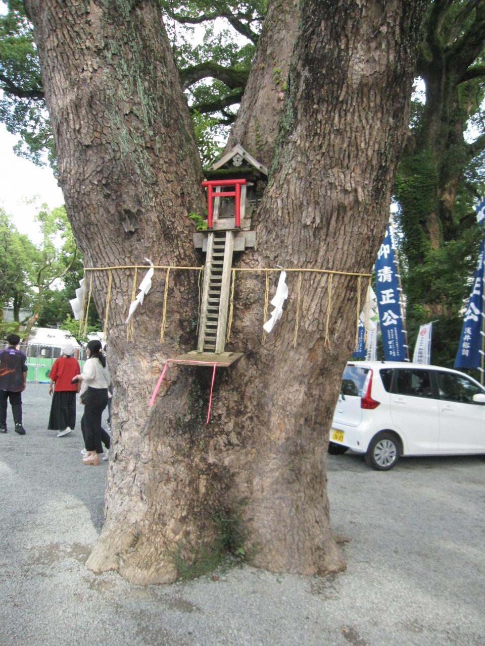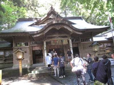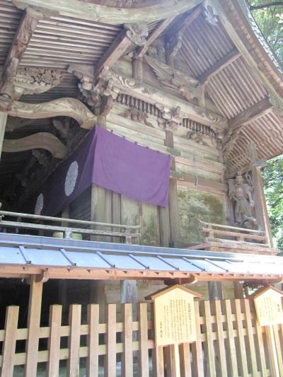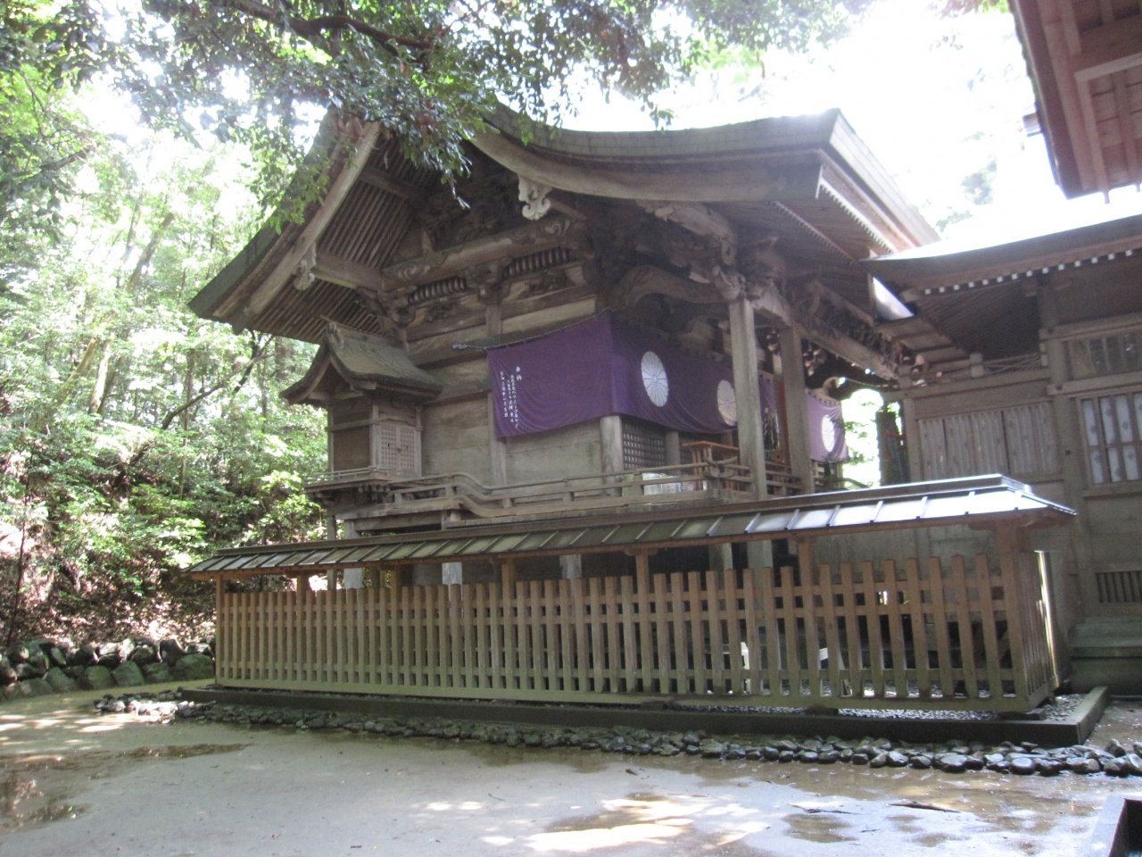 また拝殿背後の本殿を右側から見学すると、悪い神を退治した「三毛入野命」の見事な彫刻が本殿に施され、その脇には、祈ると悩みが鎮められるという「鎮石」がありました。