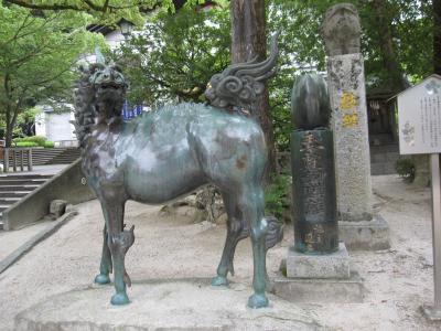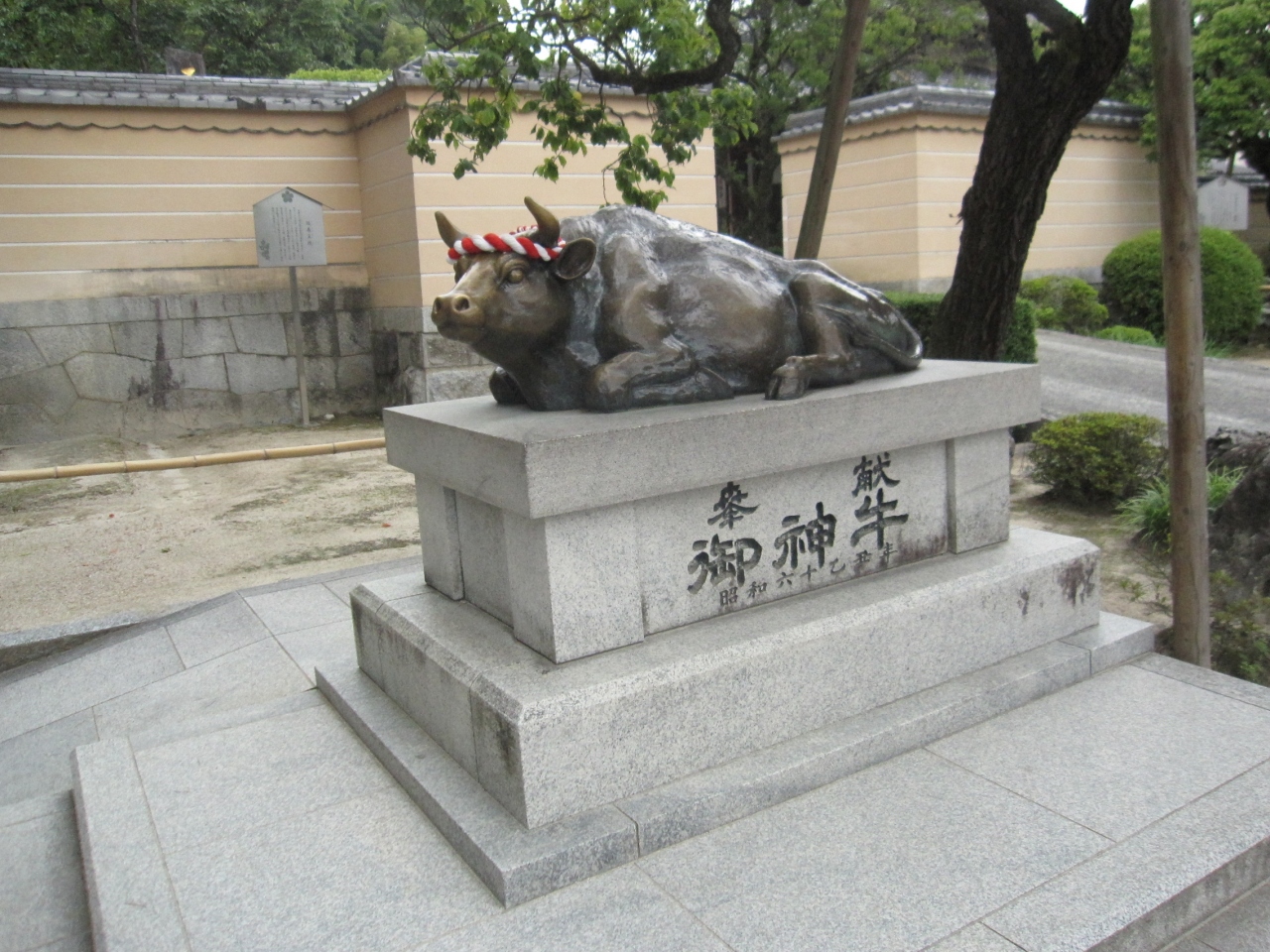 楼門前には、徳をもって世を治める王者の象徴とされ、善政や誠心を貫かれた菅原道真公の生涯と重ね合わせられて18世紀中旬に奉納された空想上の聖獣「麒麟像」や、人々が知らず知らずのうちについた嘘や罪穢れを、誠に替え幸せを運んでくれると信じられている天神様の守り鳥と言われる「鸞像」、それに「御神牛」が鎮座しています。