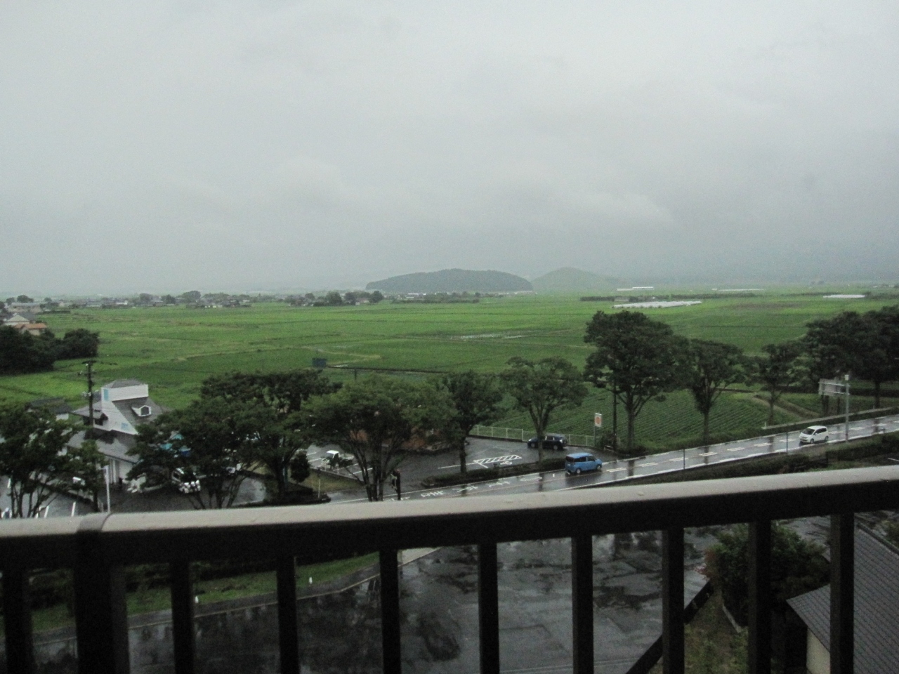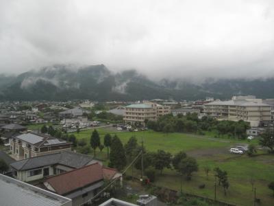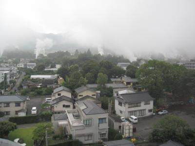 当日の天候は曇天でしたが、ホテルに到着するなりいきなり土砂降り。阿蘇五岳は雲の中です。
