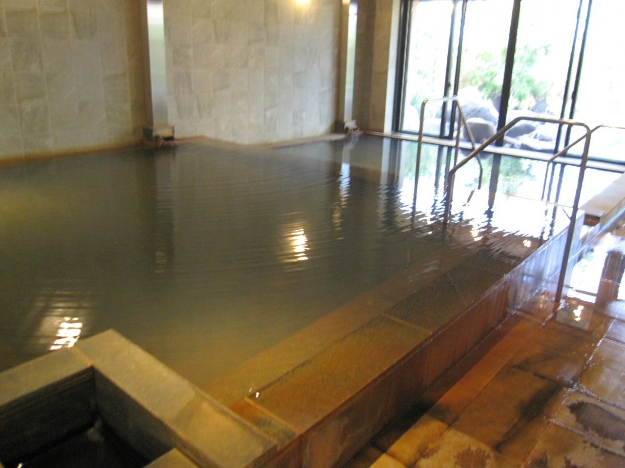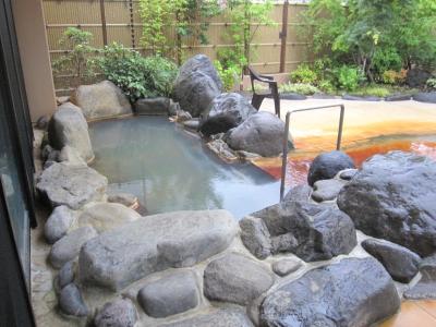 お風呂は、男女別に庭園露天風呂、大浴場、洞窟風呂があり、敷地内より湧き出る源泉掛け流しで、泉質は硫黄泉、塩類泉、硫酸塩泉だそうで、やや濁りがあり、サッパリした感じの湯でした。