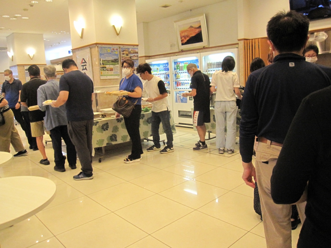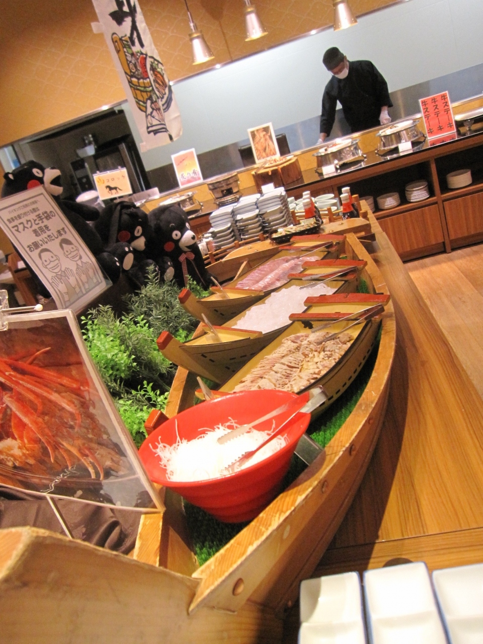料理は、カンパチ、イカ等の刺身、茹でズワイガニの足をはじめ、焼きたてステーキやしゃぶしゃぶ、にぎり寿司、馬コロッケ等々。