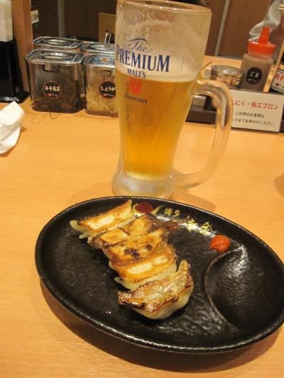私達がオーダーしたのは、濃厚「豚骨ラーメン」と「博多一口餃子」、それに生ビール。