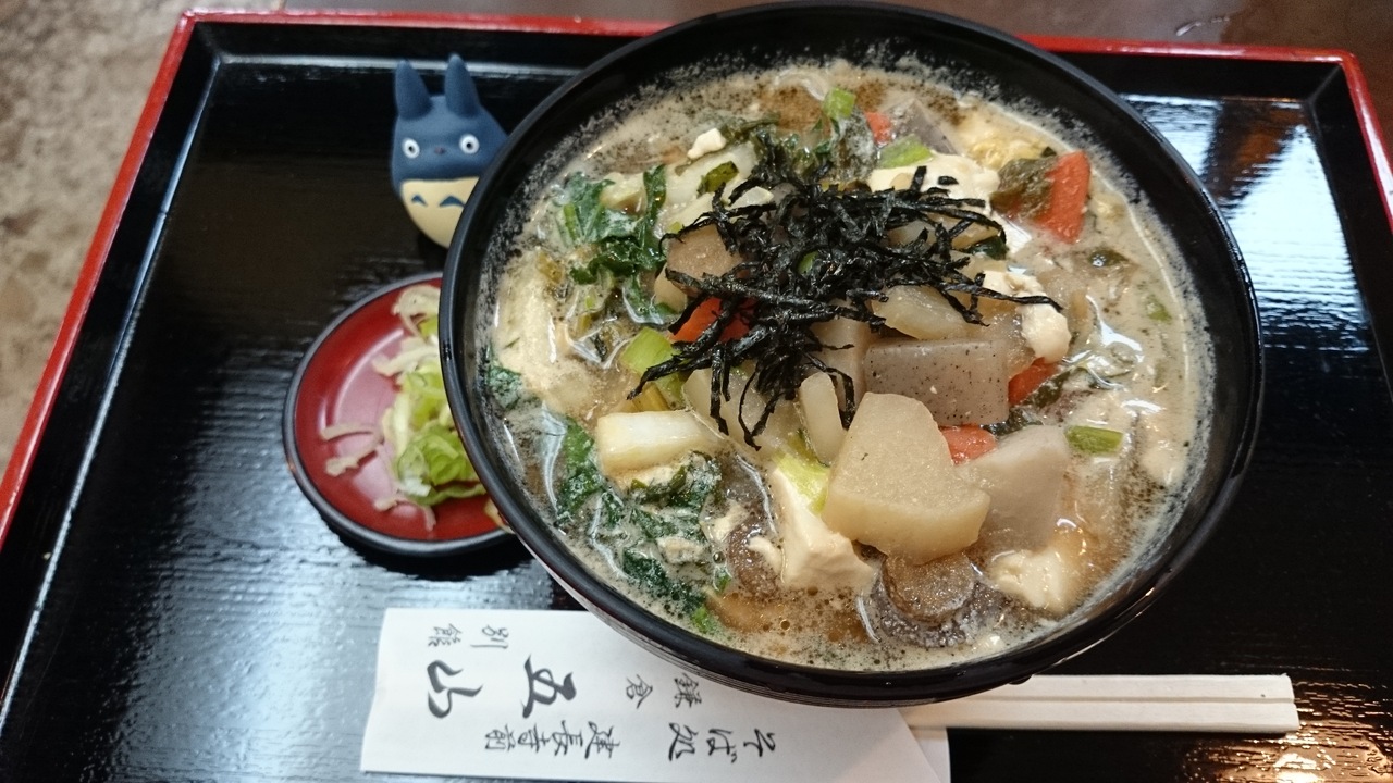 けんちん汁のうどんバージョンと思いきや、うどんが細い麺でした。うどん以外は想像通りで、具沢山で醤油ベースのだし汁!肌寒い日には、もってこい(*^^*)ホッコリさせて頂きました。 因みに、写真の中のトトロはメニューには付いていませんのであしからず!!以後、この注意メッセージは省略しますので宜しくです(^_^;