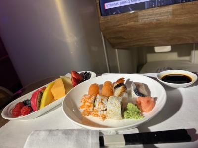 羽田行きの最初のお食事は、お寿司のコレクションとカットフルーツが一緒に...