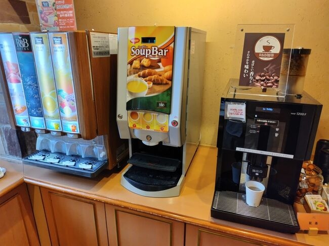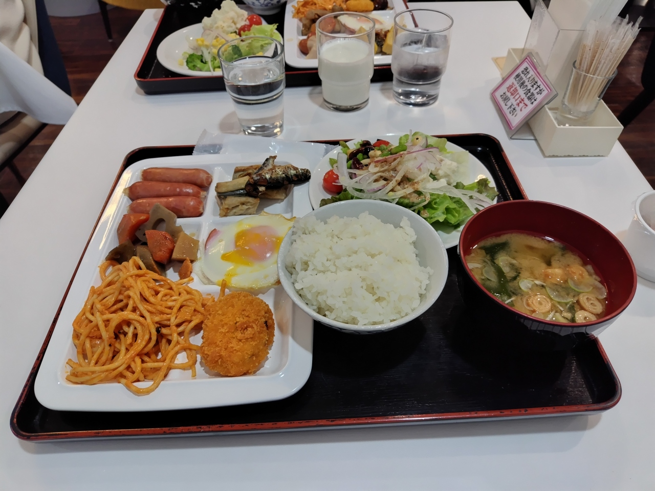 あとはサラダ、ゆで卵、スープ、ドリンク類があります。パンは日替わりです。ただ、食べるスペースがロビーなので席が少ない。すぐに埋まってしまいます。
