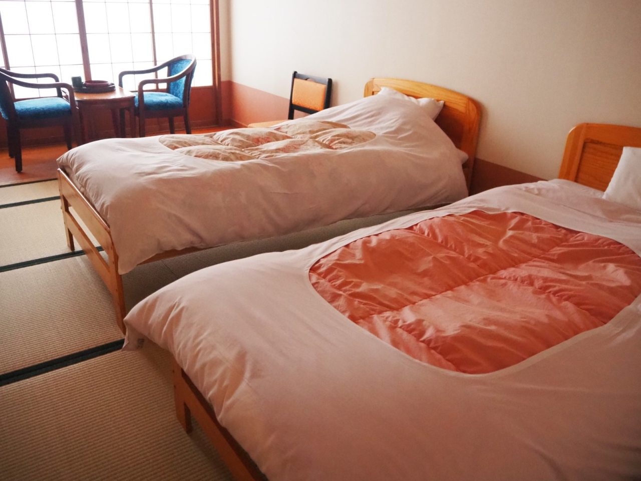 部屋は和室ですが畳の上にシングルベッドを2台並べた和洋室でした。インバウンド向きに改装したのかもしれません。
