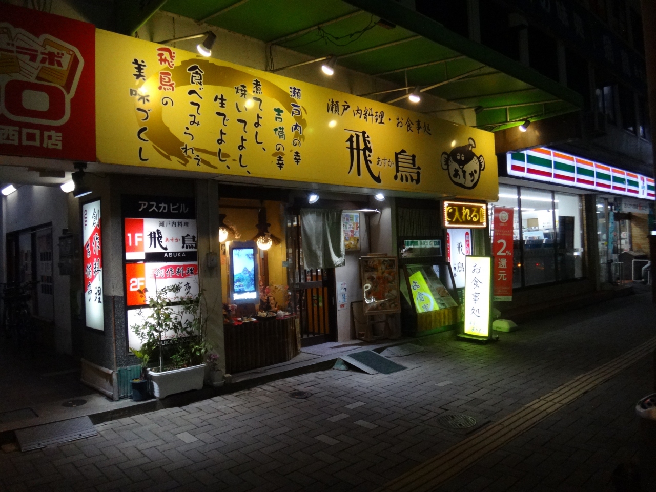 岡山駅西口にある郷土料理のお店です。西口を出ると見えます。隣りがセブンイレブンなので分かりやすいです。店内は飾らない雰囲気の居酒屋風ですが宴会場も完備しており、大人数の対応もできるようです。