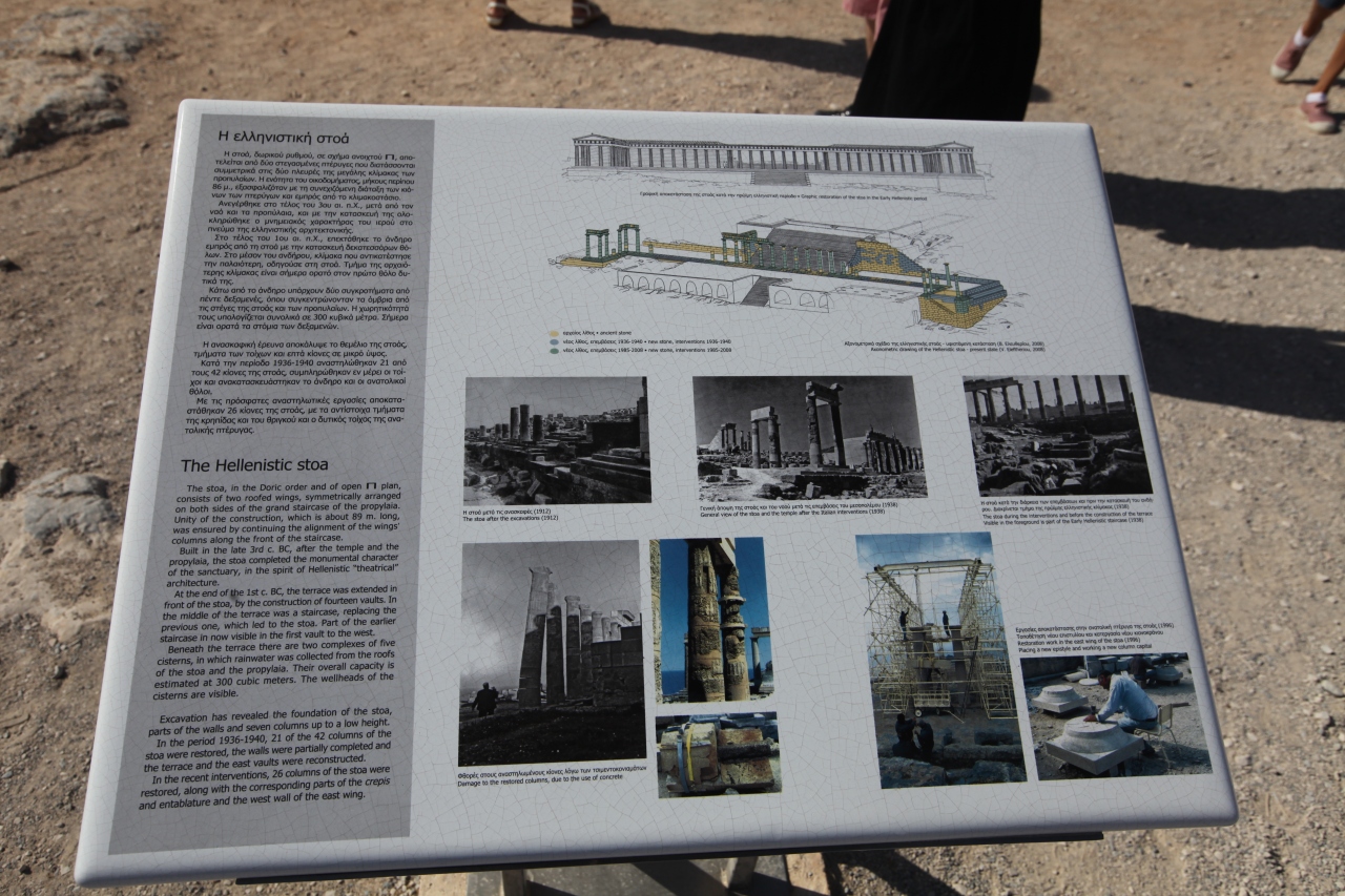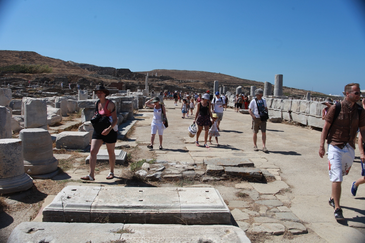 ガイドは1時間以上、広い古代都市跡の中から各時代の主なところ、アポロン神殿、デロス同盟の金庫跡、アンティゴスの柱廊、今は埋め立てられ草が生い茂る聖なる湖、ローマ人のアゴラ、仮面の家などを廻り、暑い中熱弁を振るう。