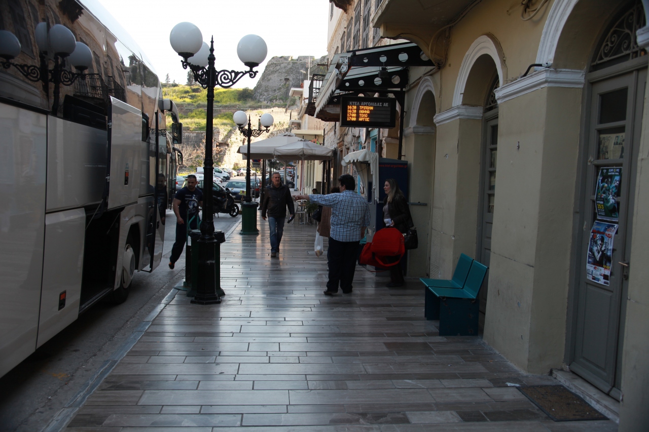 デルフィ西入り口バス停(バス停向かいのみやげ物屋さんでチケット販売) →リオシオン・バスターミナル