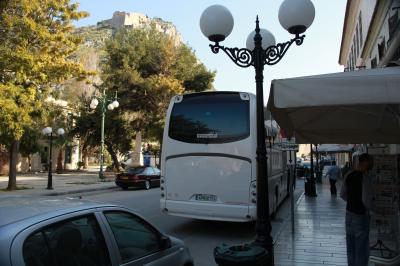 リオシオン・バスターミナル→(バス 2時間後コーヒー休憩)→デルフィ西入り口バス停まで約3時間 往復30.20ユーロ 往のみ座席指定。