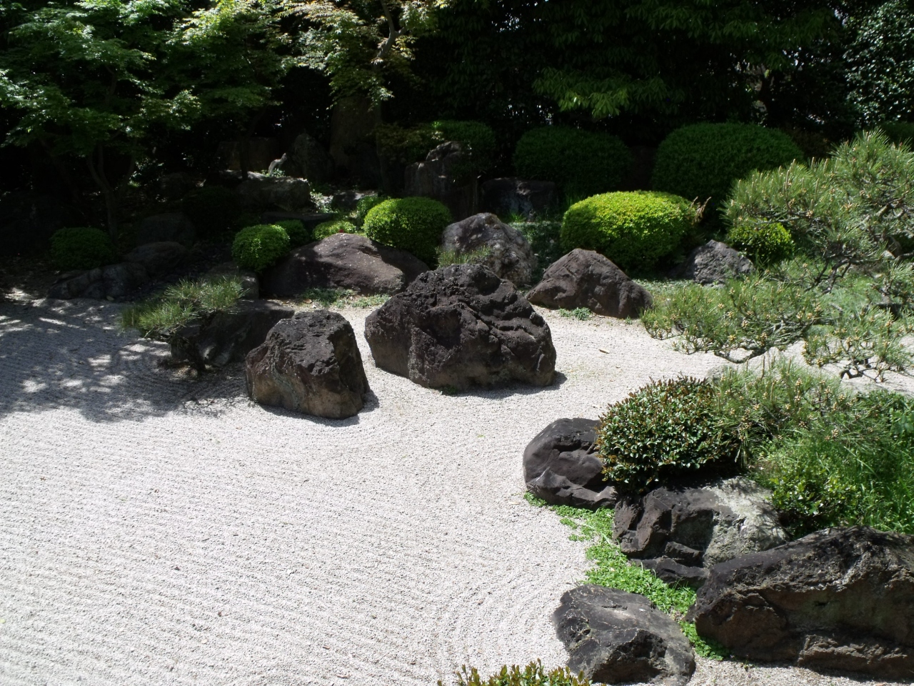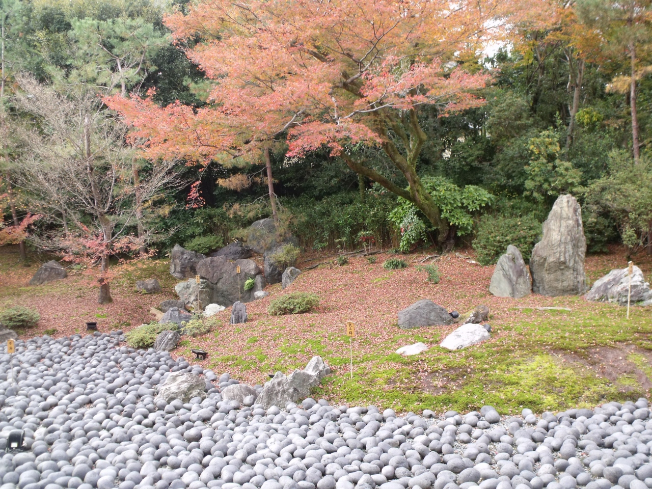 庭園は嵐山を借景にしているはずであるが、楓が大きくなりすぎて庭を殺している。その庭は滝組から特徴あるおおぶりな丸石をならべた枯山水! 滝組からの流れは、三尊石のもとへ。