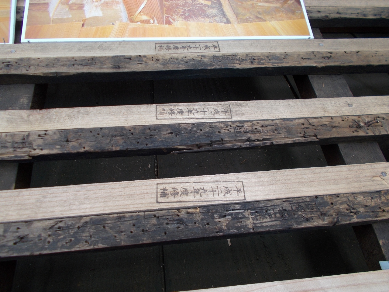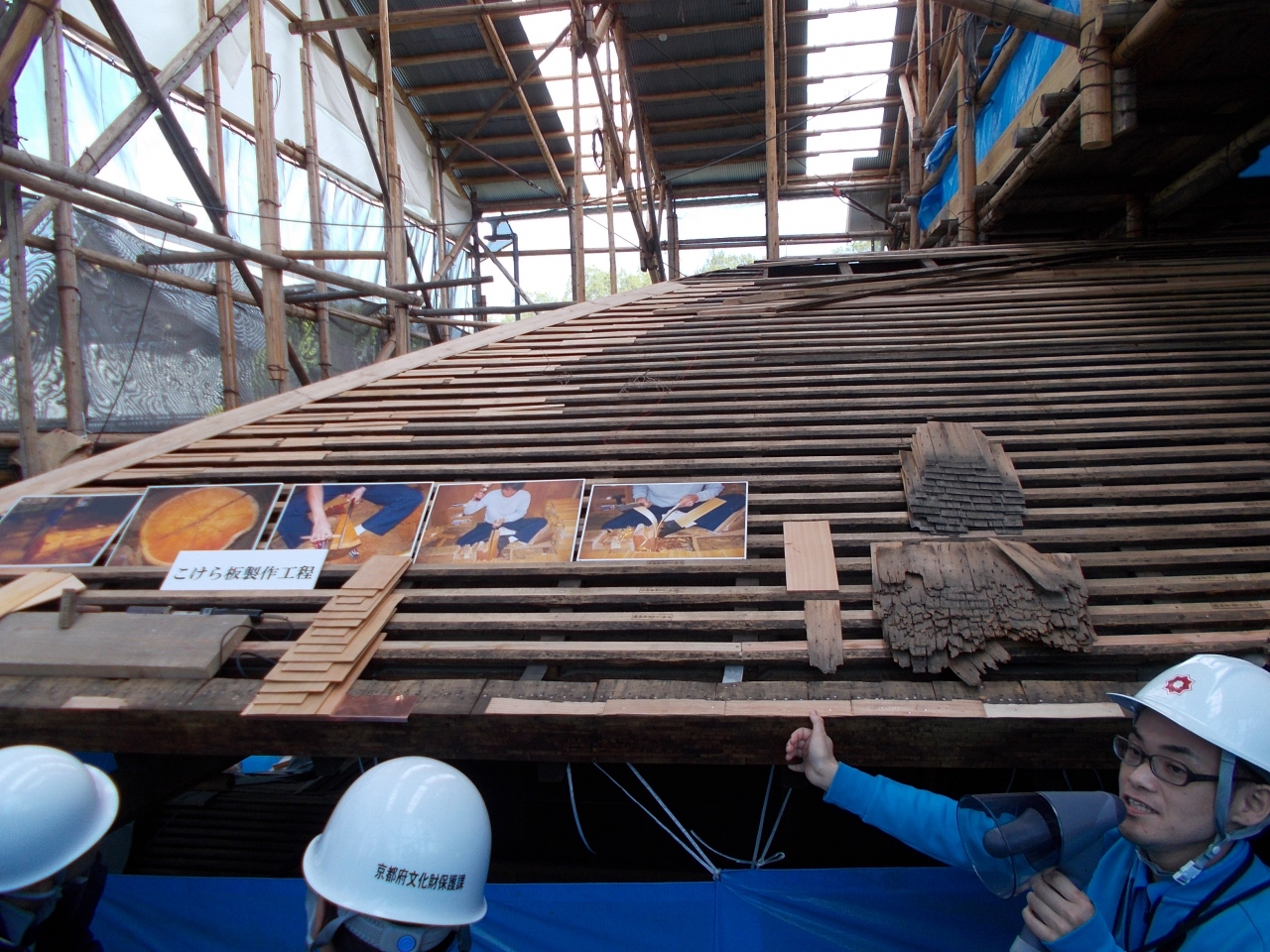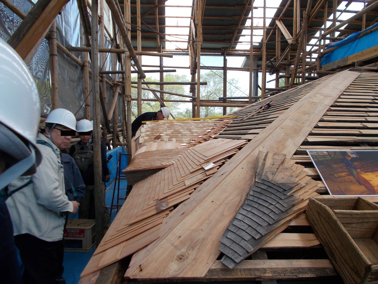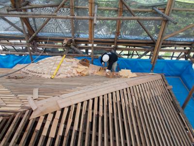 工事用の足場を上って、宮大工さんがまさに屋根をふき替えている現場を見ることができた。