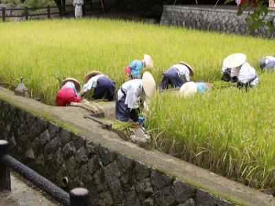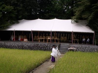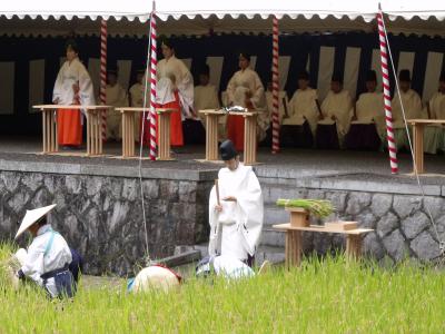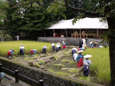 - 舞もある神事で早乙女が稲穂を刈る