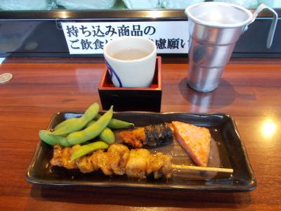 つまみはカウンターに置いてあるから選べる。焼き鳥などのつまみと豊祝1合のセットが500円で頼みやすい。酒、つまみはアメリカ式でキャッシュですぐ払う。カウンタに小銭を置いておけばとってくれる。但しチップはいらない。