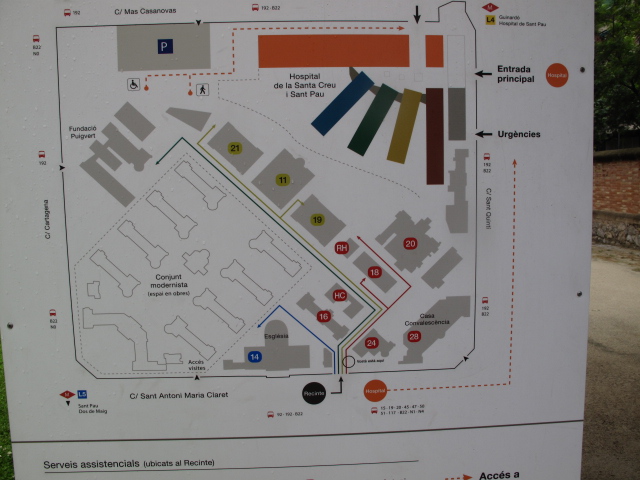 バルセロナカードを持っていたので地下鉄で行きました。(サクラダ・ファミリアから徒歩10分程なので そちらが正解かも知れません。)地下鉄の駅は新病院の方にあるので反対対角線側の入り口まで歩きます。100年前以上に建設され 実用に供された重みをを感じました。ランチは新病院のカフェで食べました。安くて美味しい。