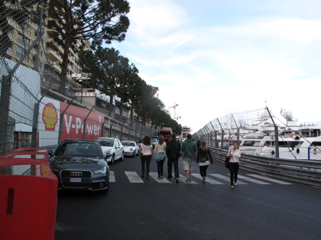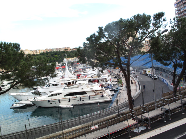 前々日の夜には 街の用意はほぼ終了。数多くの観戦用の豪華クルーズも停泊終了。観戦スタンド、目隠しフェンスも設置終了。車の整備要員の方の姿も。