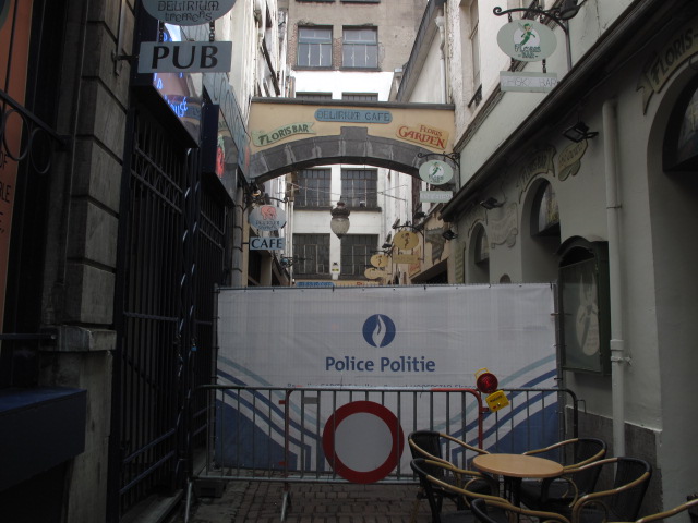 旅行書表示の地図で「王の家」から レストラン街を抜けて 行き止まりの路地まで行ったが それらしいものは無かった。代わりに 写真の白いテントで封鎖された一角があった。警察のテント?? 折角だからと思って行ったが 考えれば別段意味の有るものでは無い??