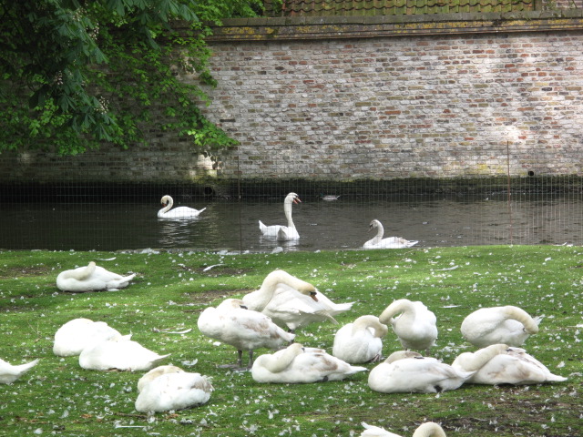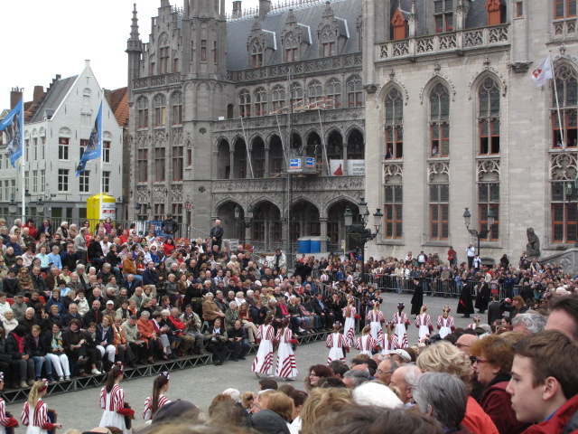 マルクト広場の仮設スタンドで「聖血行列」を見る。(当日の朝 旅行案内所で切符を購入。)街を挙げてのセレモニー。旧約聖書から十字軍まで「聖血」の関連歴史を行列で表現。寸劇も。約2時間半。年に一度の開催だが うまく時期が合えば一見の価値あり。