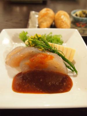 まず出してくれるのが、自家製の刺身こんにゃくとゆでたけのこ。