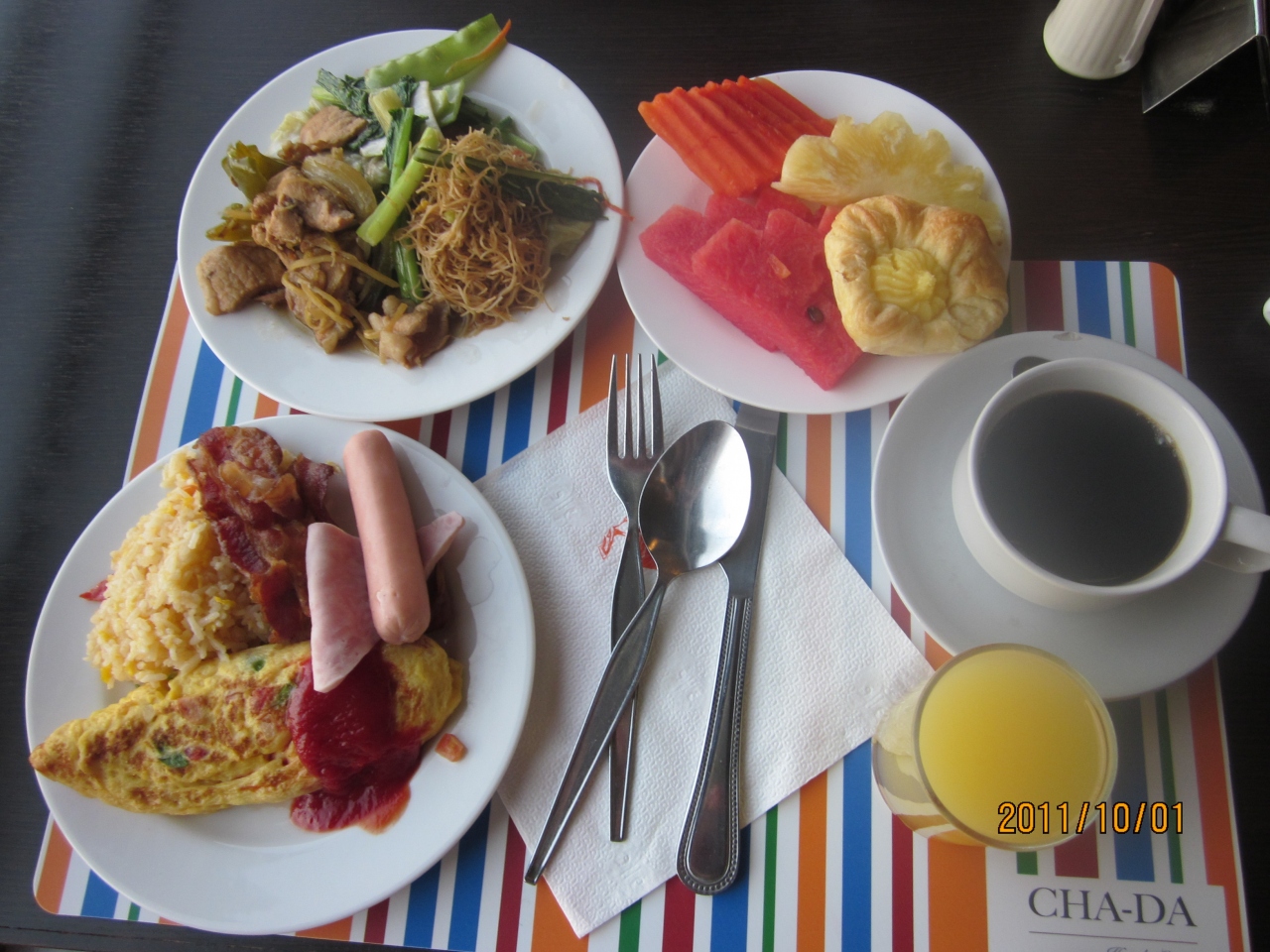 なんと、朝食付き。それも、目の前でお好みの卵料理も作ってくれますし、お粥も有ります。