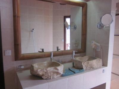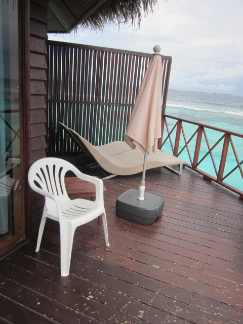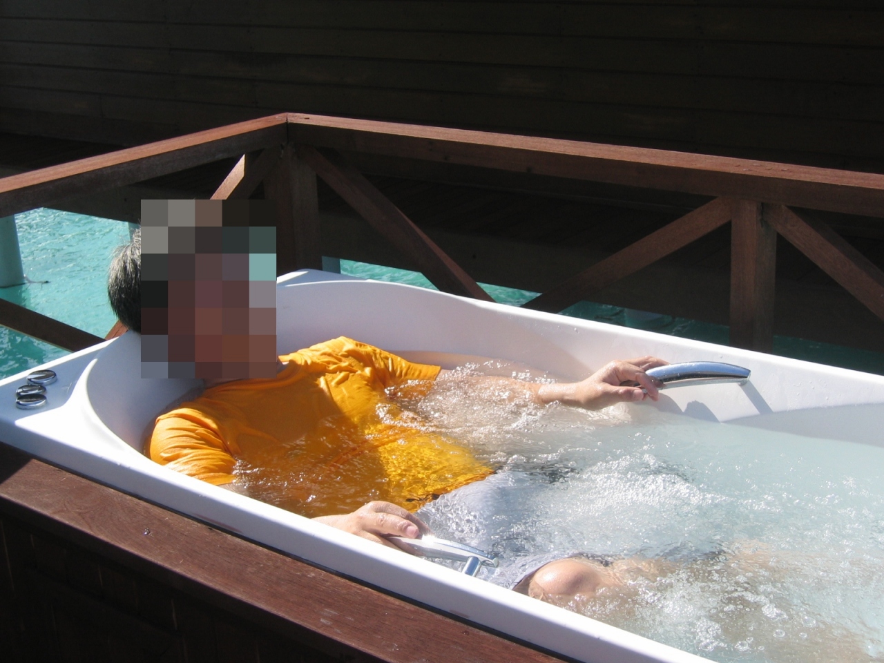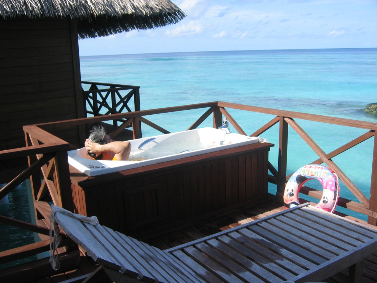一番結局お気に入りは、ベランダのジャグジー(物凄く暑い湯が張れます。と言うのは、ロビンソンに泊まりましたが、ジャグジーが広過ぎて、お湯が暖まらない・・・最悪!外国の方はそれでも良いそうですが(と現地で友達に成ったフランス人カップルの話し)、日本人には寒いです。)1人分の広さですが、もう極楽!夫は一番気に入り、モルディブの何処に行ってもこの話しばかりです。