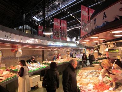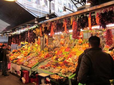 どこの国にもある、市場ですが、生ハムが脚付きのまま、ぶら下がり、お魚の種類も多いですね。野菜も新鮮!