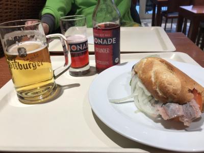 生鯖のサンドとエビのサンドとそれぞれデリコーナーで頼み、夫はサーバーのビール私は多分カシスかクランベリーのビールを注文🍺