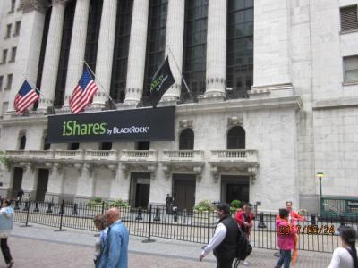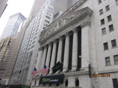私達は自由の女神を見てきた後なので、ホワイトホール通り駅から一駅のレクター通りで下車、すぐ側にトリニティー教会を見てから、ウォール街に。アメリカ最大の証券取引所で世界の金融の牽引役である場所。1903年建ち、17階建てのビルです。周りの建物が高過ぎるので、小さく感じました。