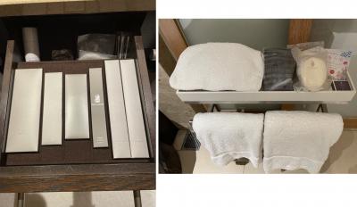 ③パジャマやビーサンなどアメニティはありがたいのですが、サイズが少し小さいです。女性Lサイズの方やふくよかな方だと窮屈だと思います。ビーサンは24.5㎝の女性では足がはみ出ます。
