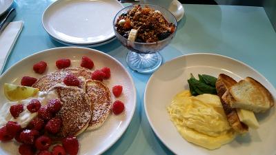 オーガニックスクランブルエッグとアサイボウル、バターミルクパンケーキ、ウォーターメロンスムージー、チョコレートシェイクを注文。