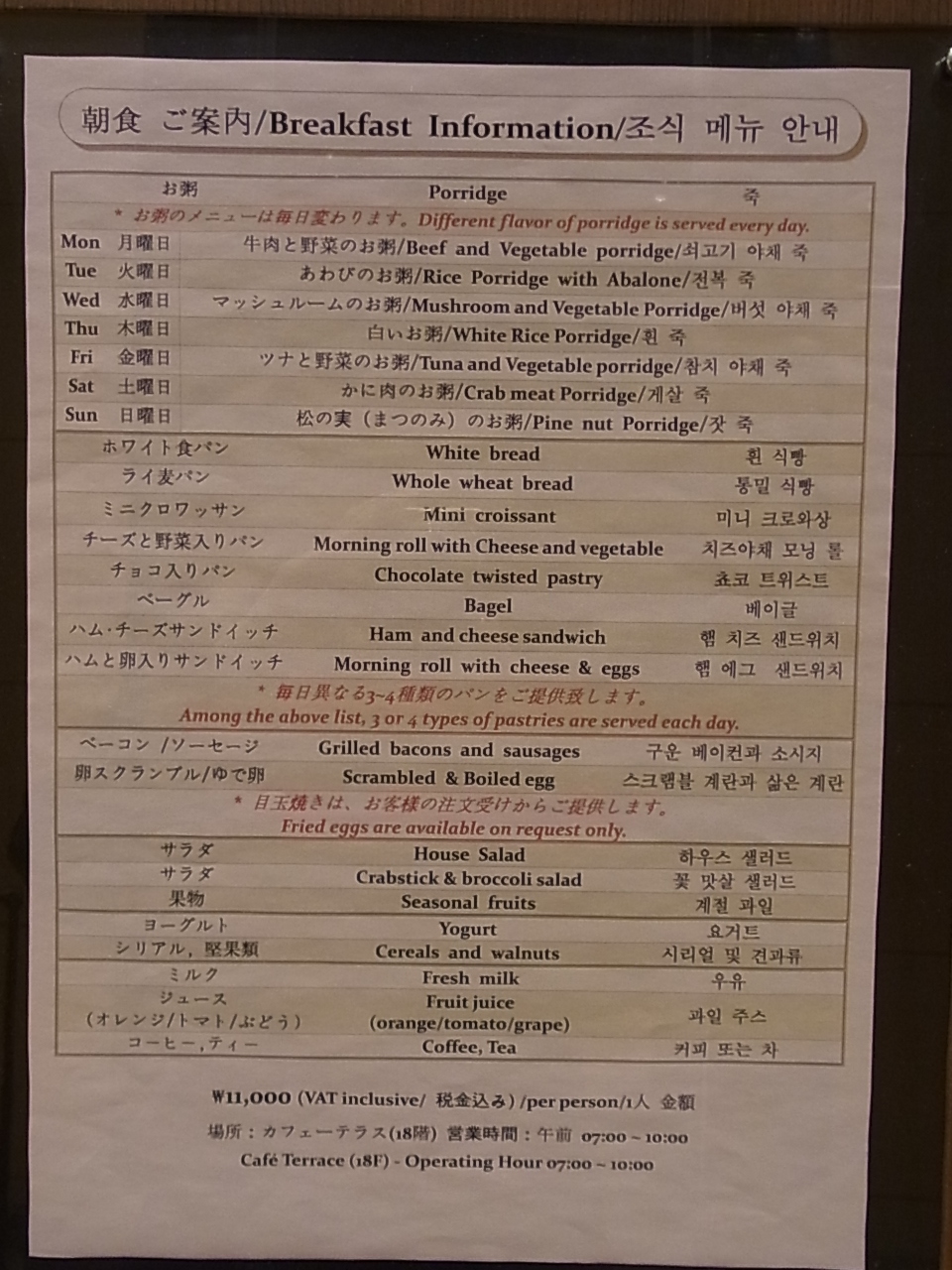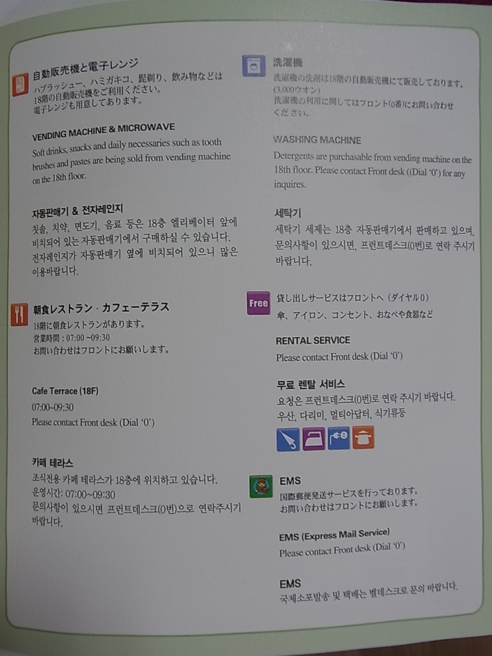 フロントは日本語可能のスタッフが常時いるので安心。またPCが一台置いてあるので調べ物もできます。ホテルの隣はカフェになっていて宿泊者はW3500(間違ってるかも)で朝食が食べられます。