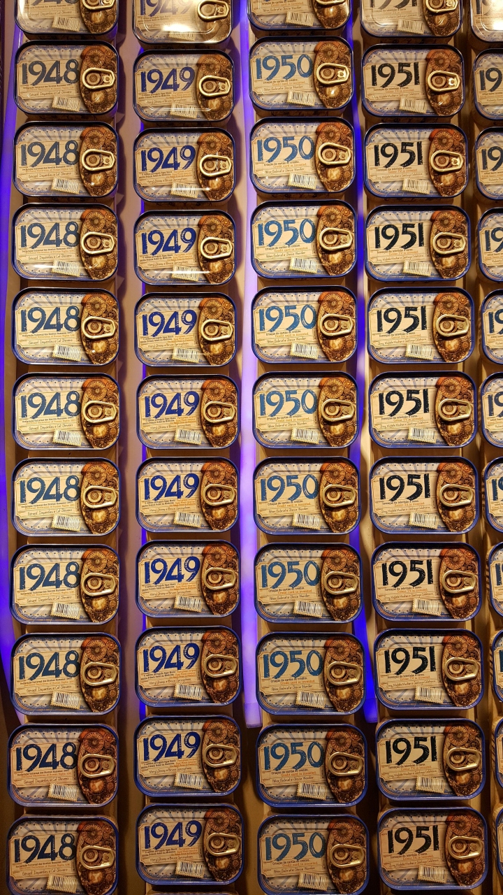 カフェ・二コラの椅子で通りを眺めるのもよし、近くには面白い店、缶のラベルに生まれ年を印刷したイワシ缶を売るお店もありました。最近ブレイクしているそうです。