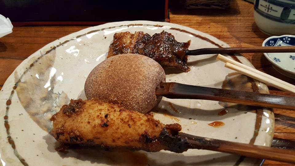 いろりの炭で順番に焼いてくれる味噌田楽は素材も良いし焼き手の気持ちが入っています。こんにゃくから始まりサトイモ、厚揚げ、ニシン、五平餅,つき立て餅、それにシイタケやチーズパンなども追加でやいてもらいました。