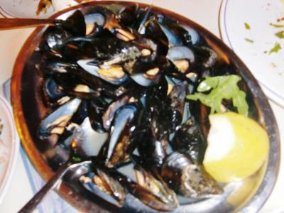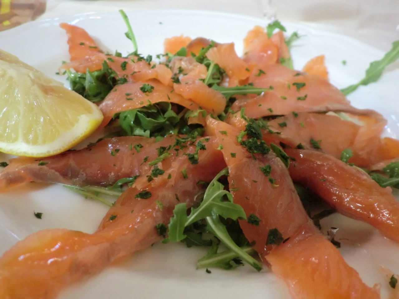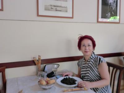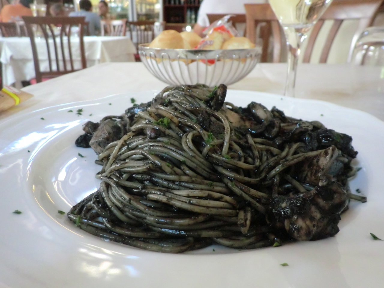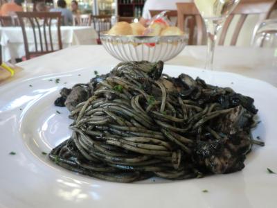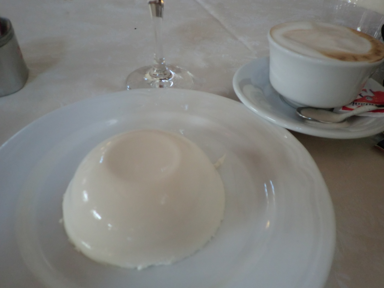 このあたりはサーモンがおいしく、前菜はサーモン、セピアのパスタ、ブラマンジェ、白ワインのグラスにカフェ。