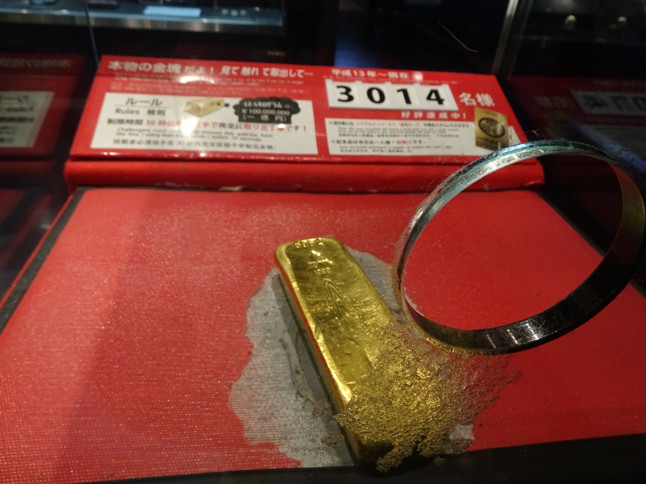 ここでの注目は金の延べ棒を片手でつかんで、丸い窓から外に出せるか。