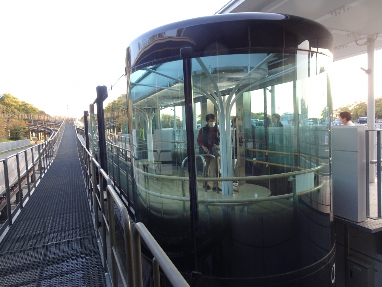 楕円形の2つの連結した車両に乗って、猿鹿放牧場を眼下に樹木が茂る中を山頂まで進みます。