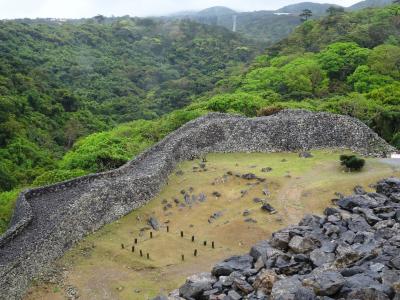 本丸があったっだけにやや平地ではありましたが、城壁の端に立つと眼下に見えるのは、ゴツゴツした岩肌と、波打つような地面の草地。