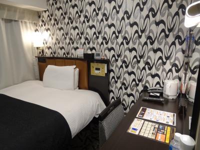 客室はモノトーンの内装にベットはダブルサイズで、ゆったり快適。