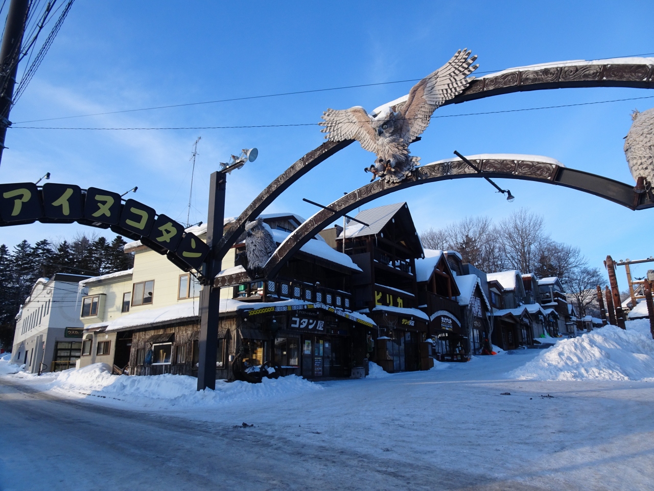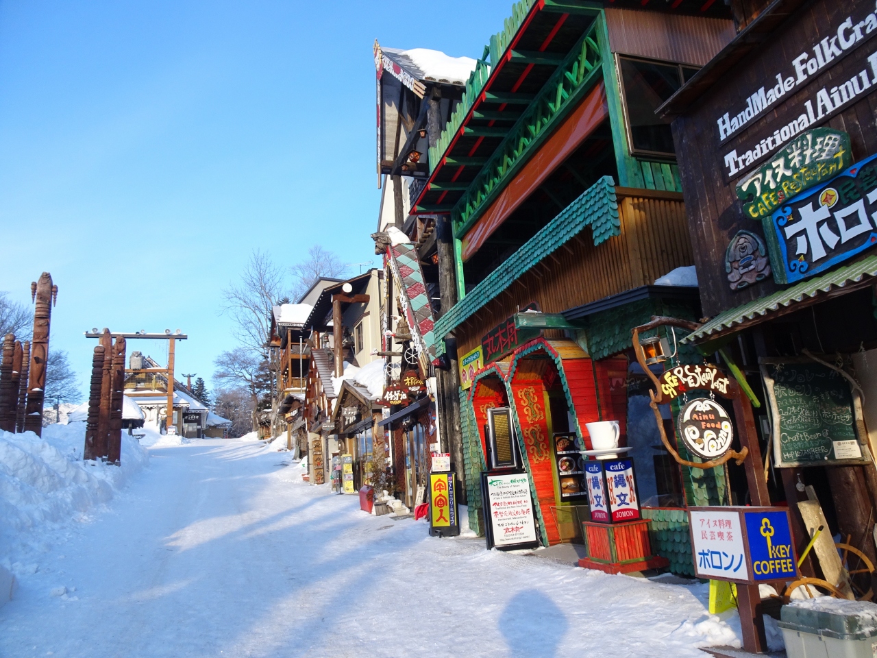 道路の頭上に大きく「アイヌコタン」の表示があり、その右側のやや坂になっている両側に木彫りの店を構える独特の文化の家屋が続きます。