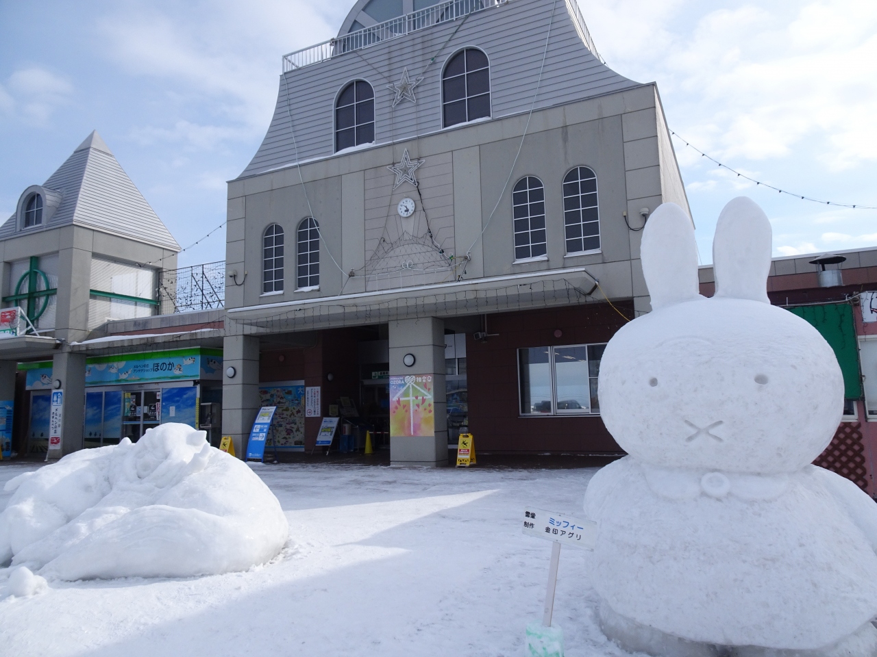 また道の駅前には可愛らしいキャラクターの雪像が作られていて、こちらも観光客に人気です。- 旅行時期