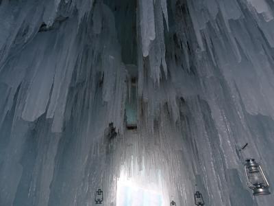 支笏湖の水をスプリンクラーで吹き付けて凍らせてつくったという氷の美術館。